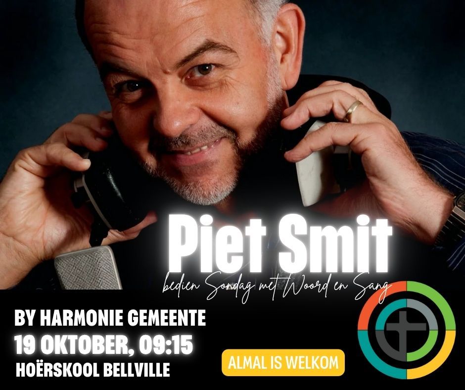 Piet Smit bedien met Woord & Sang, eerskomende Sondag by Harmonie Gemeente, Hoërskool Bellville, om 09:15.