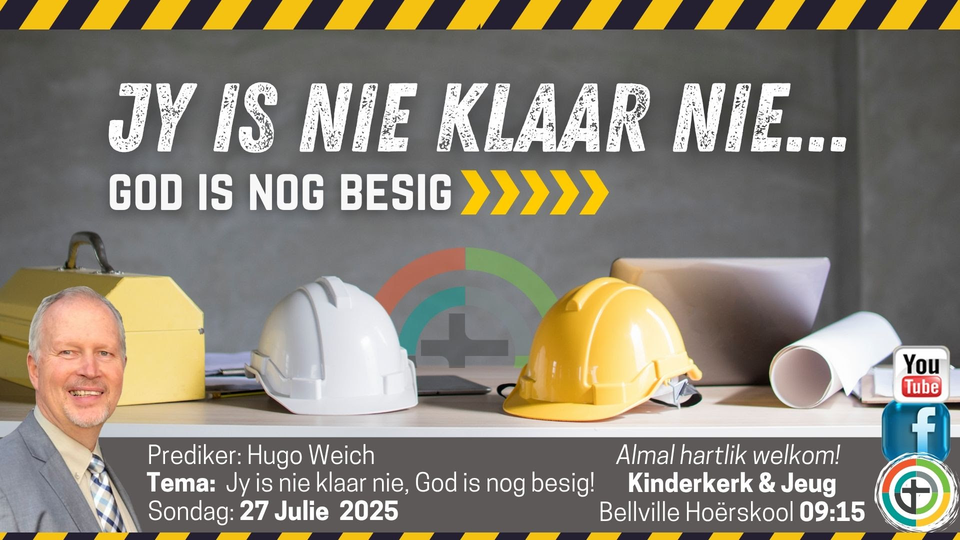 ns almal is werke in proses — stukkend op plekke, bouwerk op ander. Maar jy moet besluit: Gaan jy deel wees van dit wat God besig is om te bou in jou lewe? Hierdie SONDAG skop ons af met ’n kragtige reeks: “Onder konstruksie –jy is deel van die plan!” Of jy nou op jou sterkste of op jou broosste is, hierdie reeks is vir JOU. Moenie dit misloop nie. Dis tyd om weer in lyn te kom met wat God in jou hart wil doen!