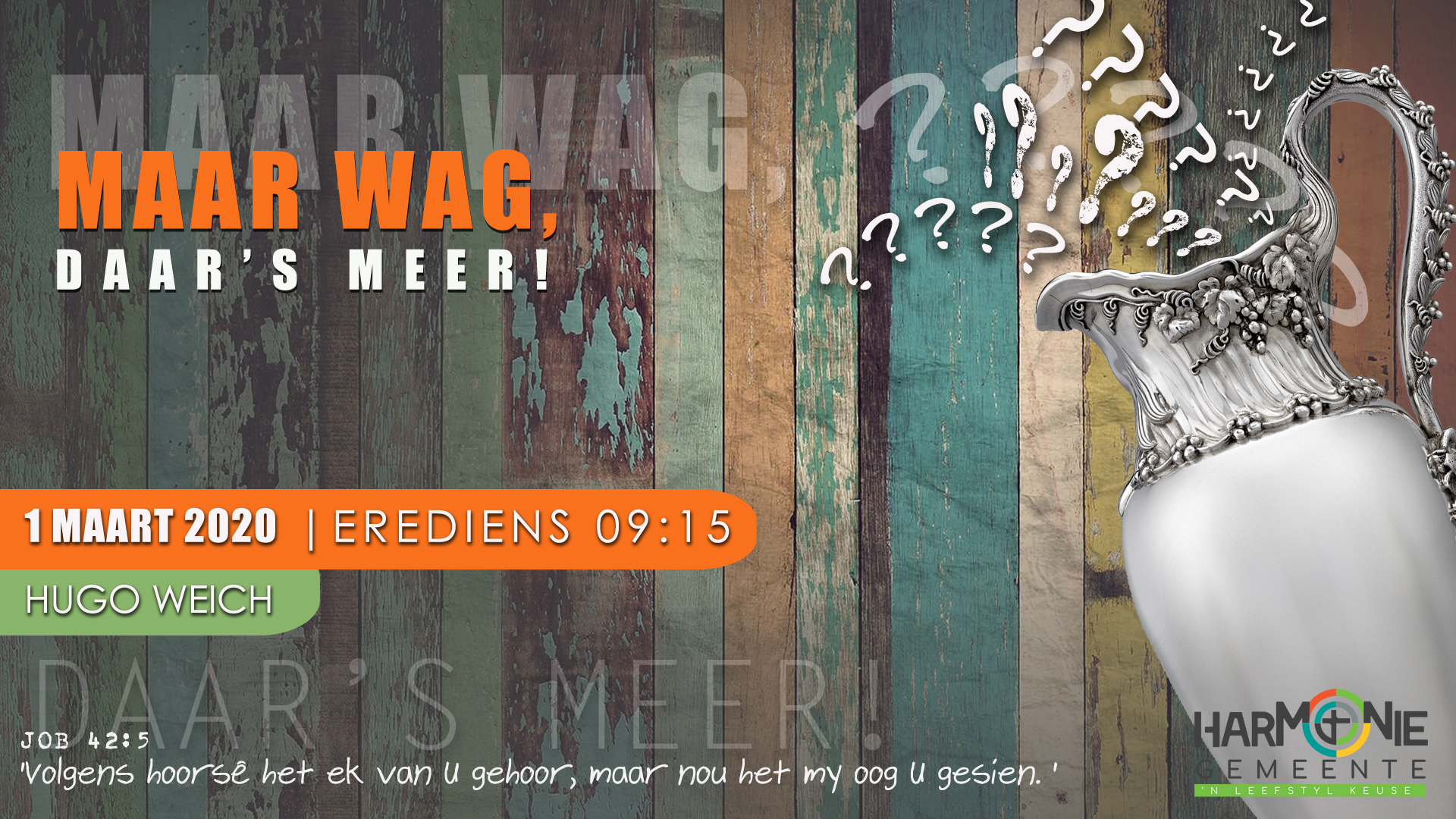 Hugo Weich Sondag 1 Maart 2020 Maar wag, daar’s meer... & Nagmaal Genesis 44:1-13 'TOE gee hy bevel aan die opsigter oor sy huis en sê: Maak die sakke van die manne vol met lewensmiddele soveel as hulle kan vervoer, en sit elkeen se geld bo in sy sak; en my beker, die silwerbeker, moet …